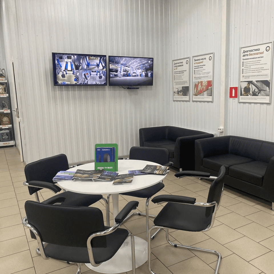 Приятно удивили работой: колеса поменяли оперативно, старые аккуратно упаковали и сложили в багажник. Видно, что мастера работают профессионально. Есть удобная зона ожидания с экраном - можно наблюдать за процессом.