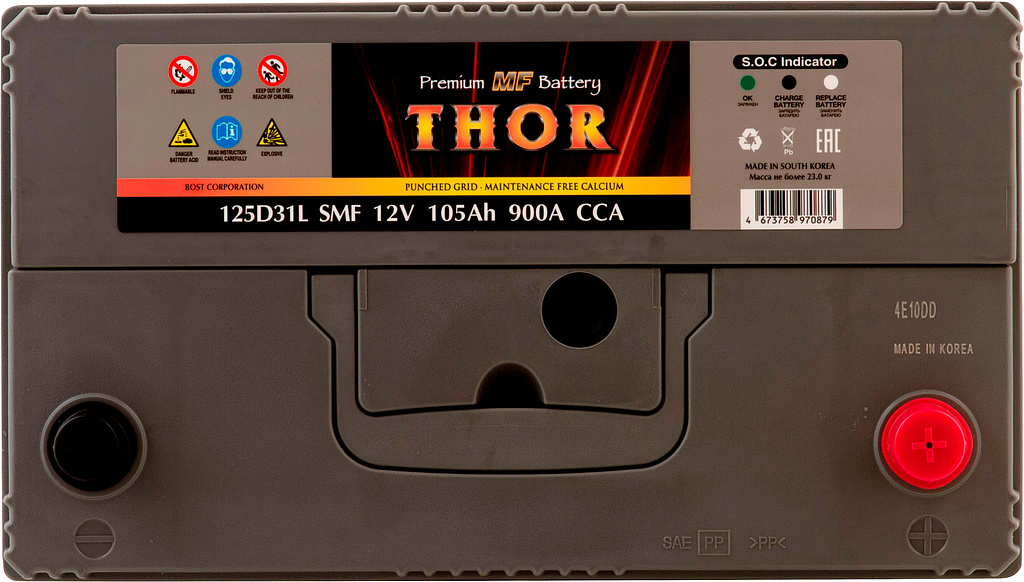 Автомобильный аккумулятор THOR SMF — серия аккумуляторов премиум-класса, выпускаемая заводом BOST CORPORATION (Южная Корея). Производитель применяет запатентованные технологии и материалы высокого качества, обеспечивая стабильную работу и продолжительный срок службы батарей.